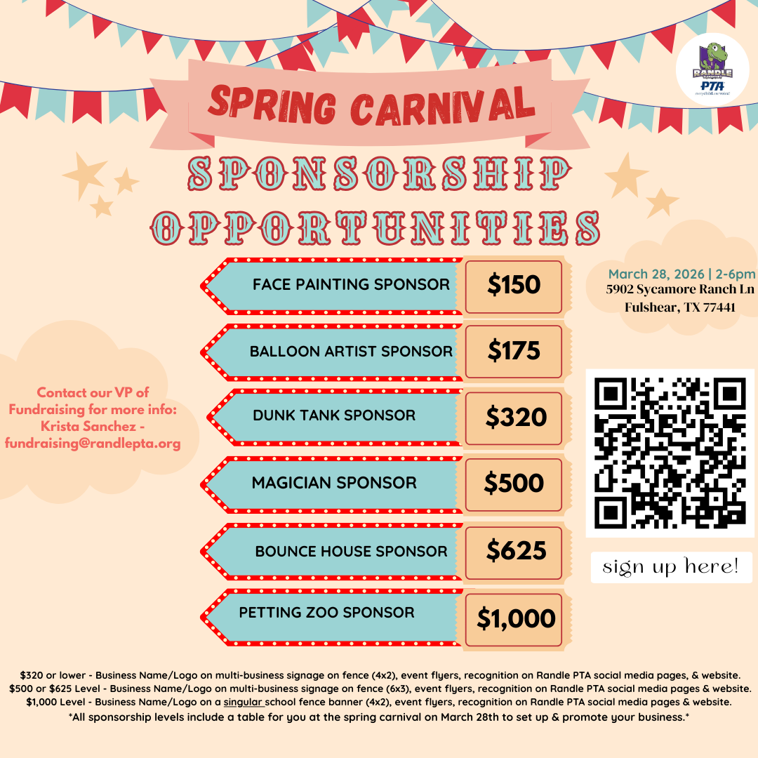 *$320 or lower – Business Name/Logo on multi-business signage on fence (4×2), event flyers, recognition on Randle PTA social media pages & website.